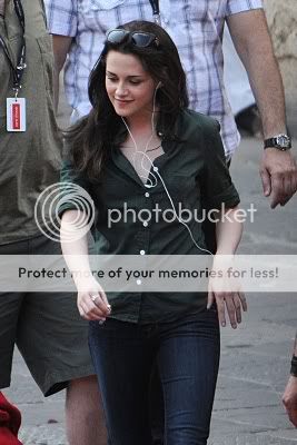 A new picture of Kristen from Italy. Looks like she is jamming to her ipod getting ready for the scene or just taking a break between takes. Either way she looks happy.